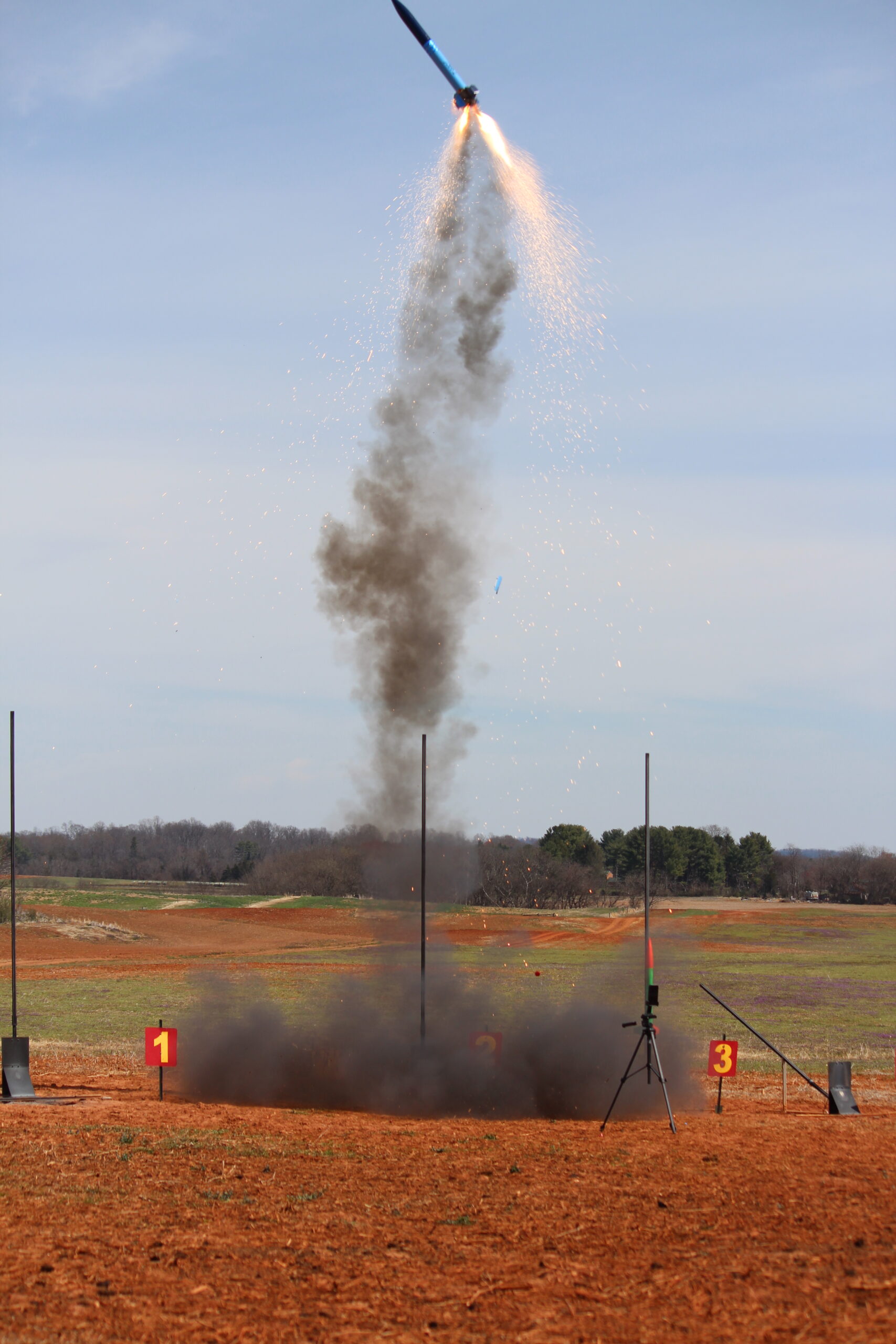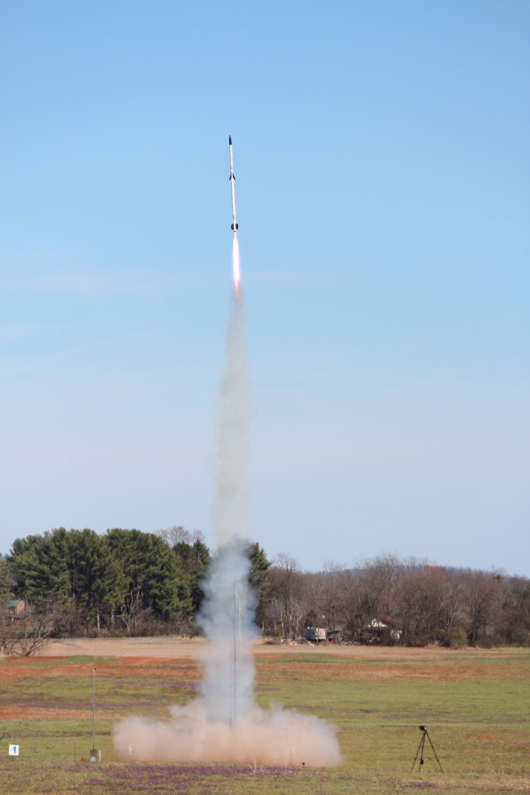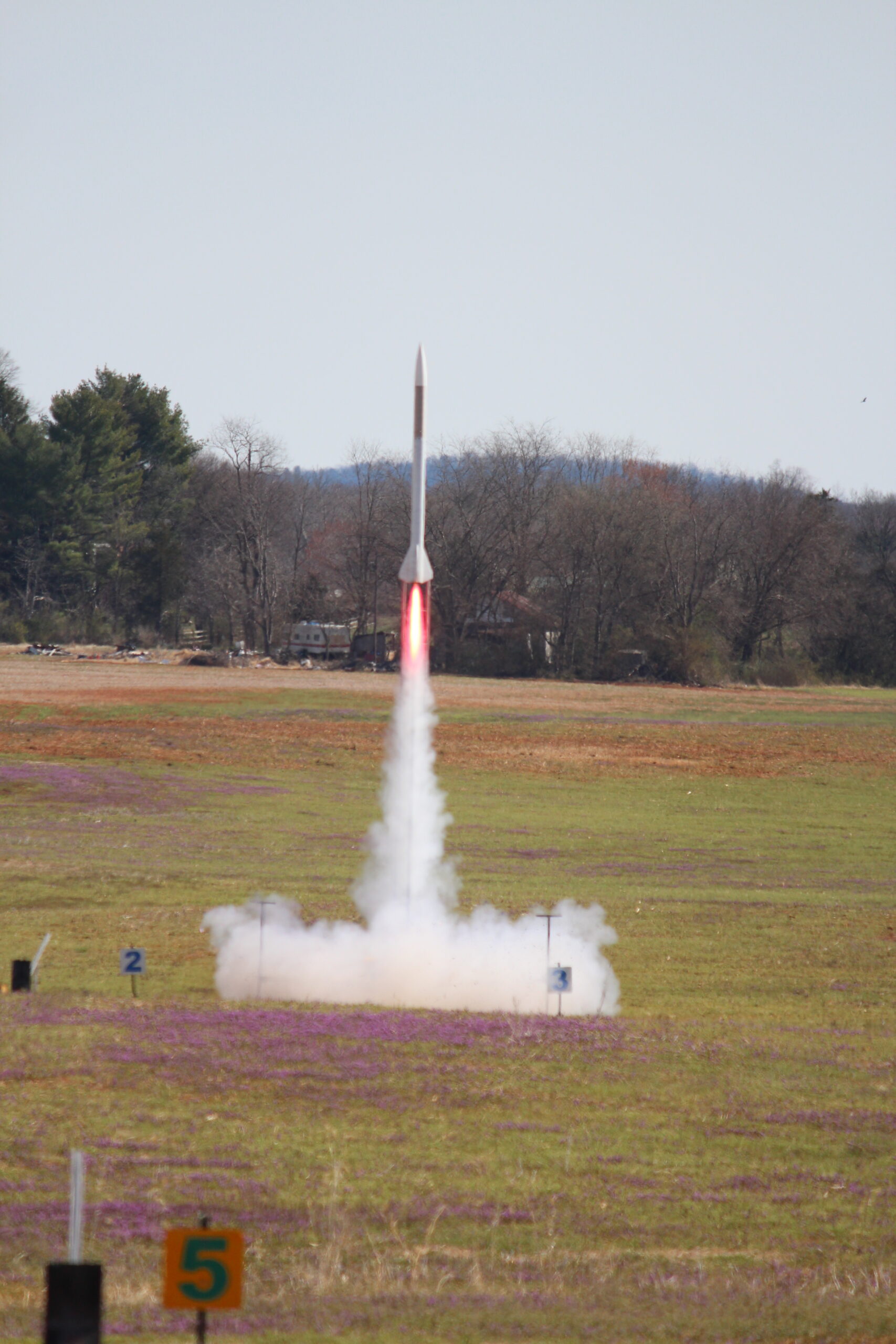 Right up close and personal with an Estes Pro Series II Nike Smoke powered by an Aerotech G76 Mojave Green.A 4″ Nike Smoke hauling off the pad courtesy of an Aerotech J270 White Lightning. This flight was 100% successful and earned the flyer a level 2 certification.The OLVT Team from Virginia Tech came out with a VERY nice two stage rocket. The booster held an Aerotech K2050 with a J250 in the sustainer. Unfortunately, the sustainer failed to light, however, all of the electronics functioned as designed, and each piece landed safely in the field. Some nice Mach Diamonds from this EX I210 that powered a LOC Precision Caliber ISP to 2,200′. One of the most sentimental flights of the entire season, our past Prefect and long time member Jeff flew his PML Callisto on an H180. This was his last flight with the club, and also a flight that put him over 1,000,000 total feet flown in his rocketry career. More, this Callisto was the first rocket he flew with Tripoli Central VA when he began flying with us in 2003.