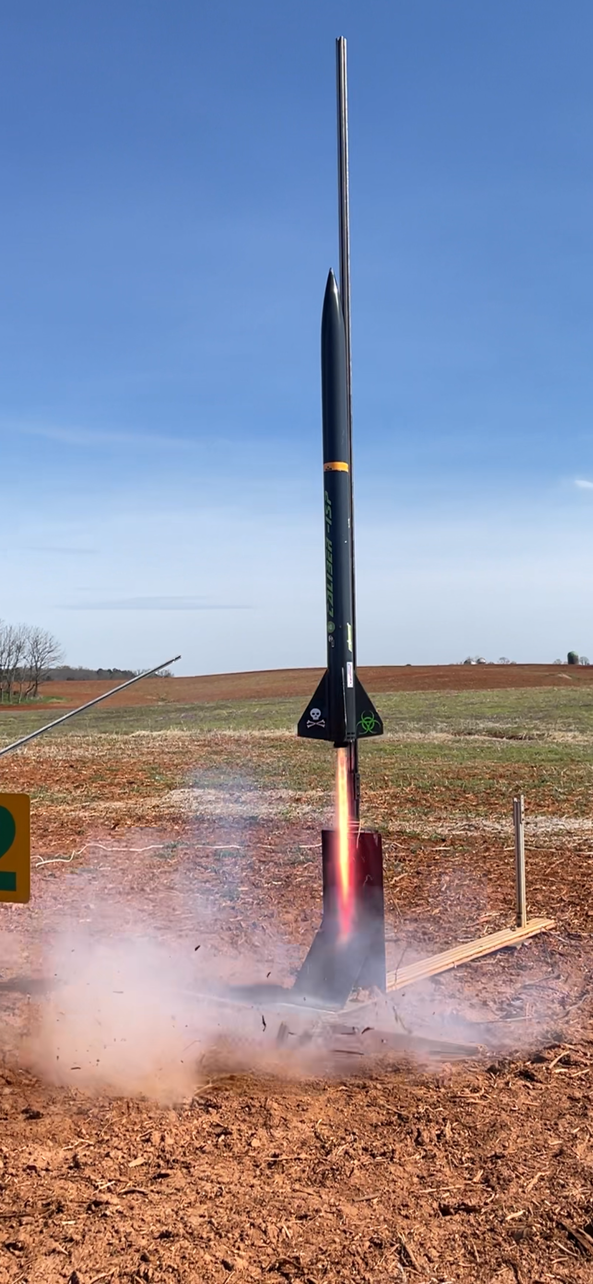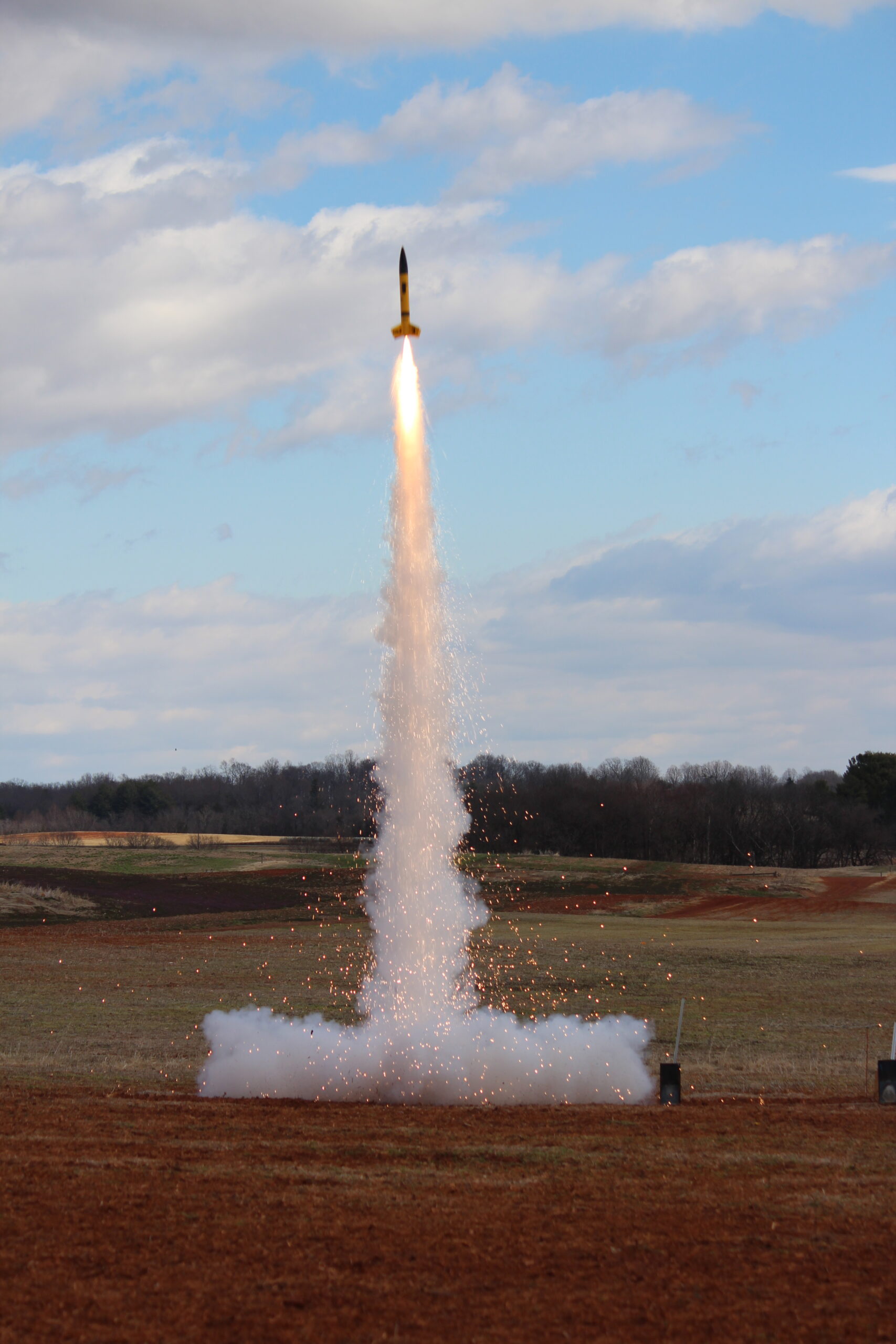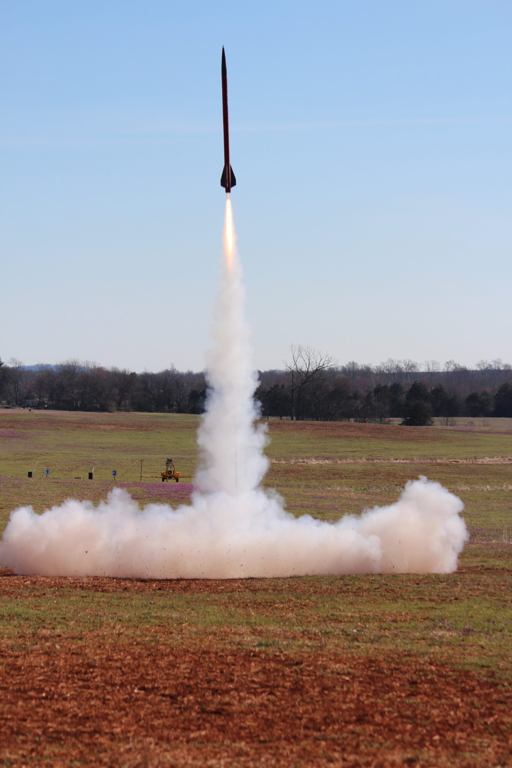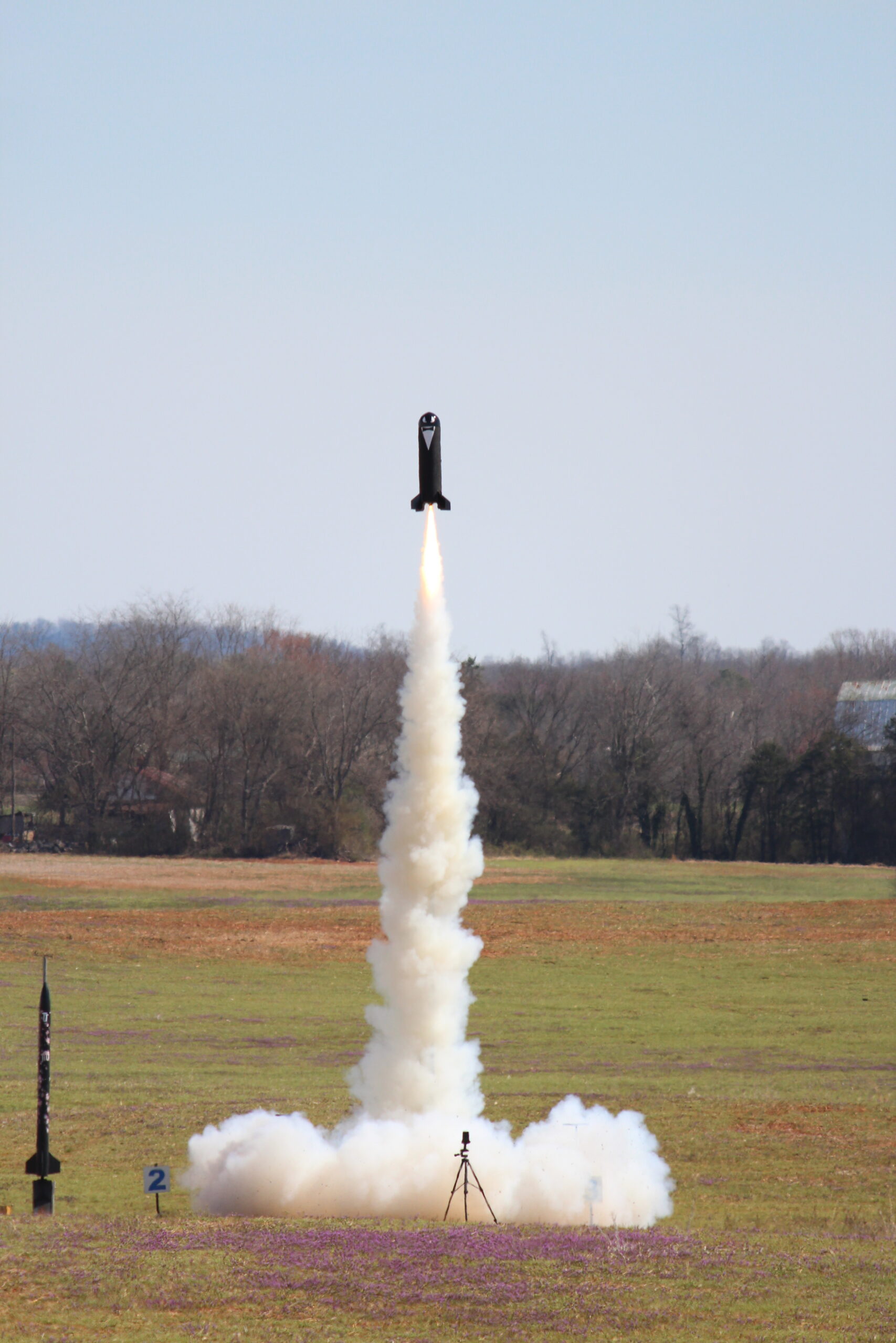 Right up close and personal with an Estes Pro Series II Nike Smoke powered by an Aerotech G76 Mojave Green.A 4″ Nike Smoke hauling off the pad courtesy of an Aerotech J270 White Lightning. This flight was 100% successful and earned the flyer a level 2 certification.The OLVT Team from Virginia Tech came out with a VERY nice two stage rocket. The booster held an Aerotech K2050 with a J250 in the sustainer. Unfortunately, the sustainer failed to light, however, all of the electronics functioned as designed, and each piece landed safely in the field. Some nice Mach Diamonds from this EX I210 that powered a LOC Precision Caliber ISP to 2,200′. One of the most sentimental flights of the entire season, our past Prefect and long time member Jeff flew his PML Callisto on an H180. This was his last flight with the club, and also a flight that put him over 1,000,000 total feet flown in his rocketry career. More, this Callisto was the first rocket he flew with Tripoli Central VA when he began flying with us in 2003.
