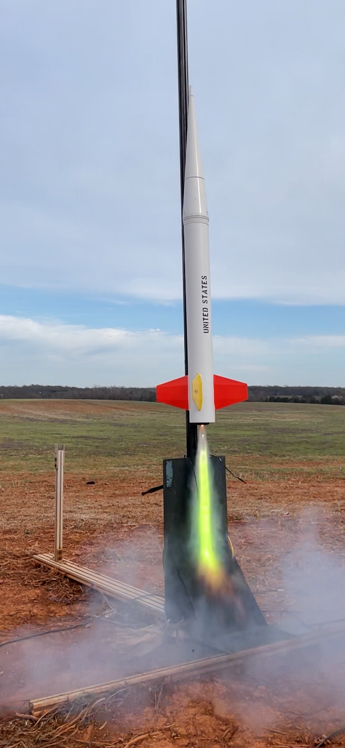 A WildMan Drago 4 dubbed EX-1127 lifting off on an EX J480. This 8grain 38mm motor used a modified red propellant to provide a beautiful burn to almost 3,000 feet. Recovery curtesy of Missile Works electronics and Top Flight parachutes.
