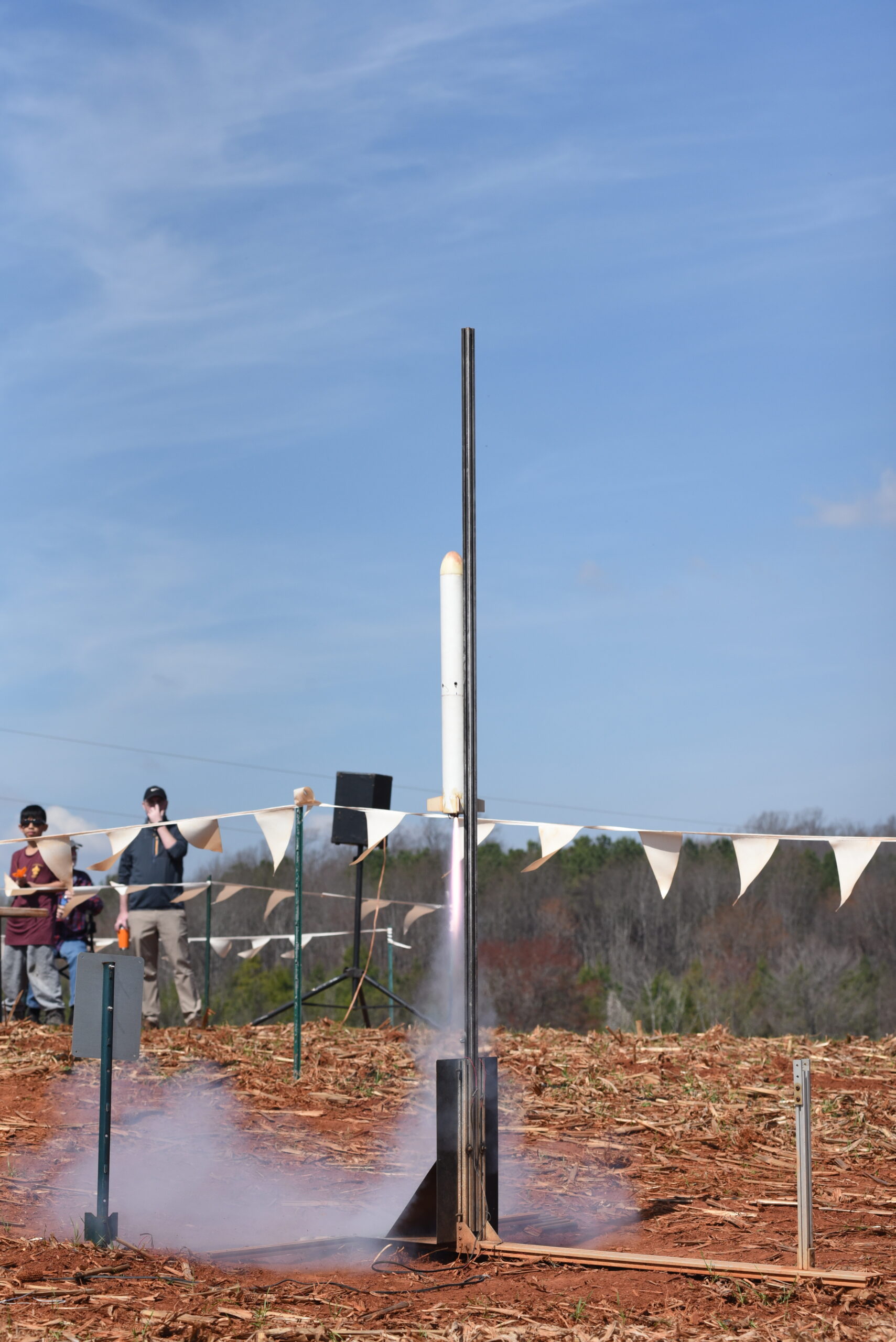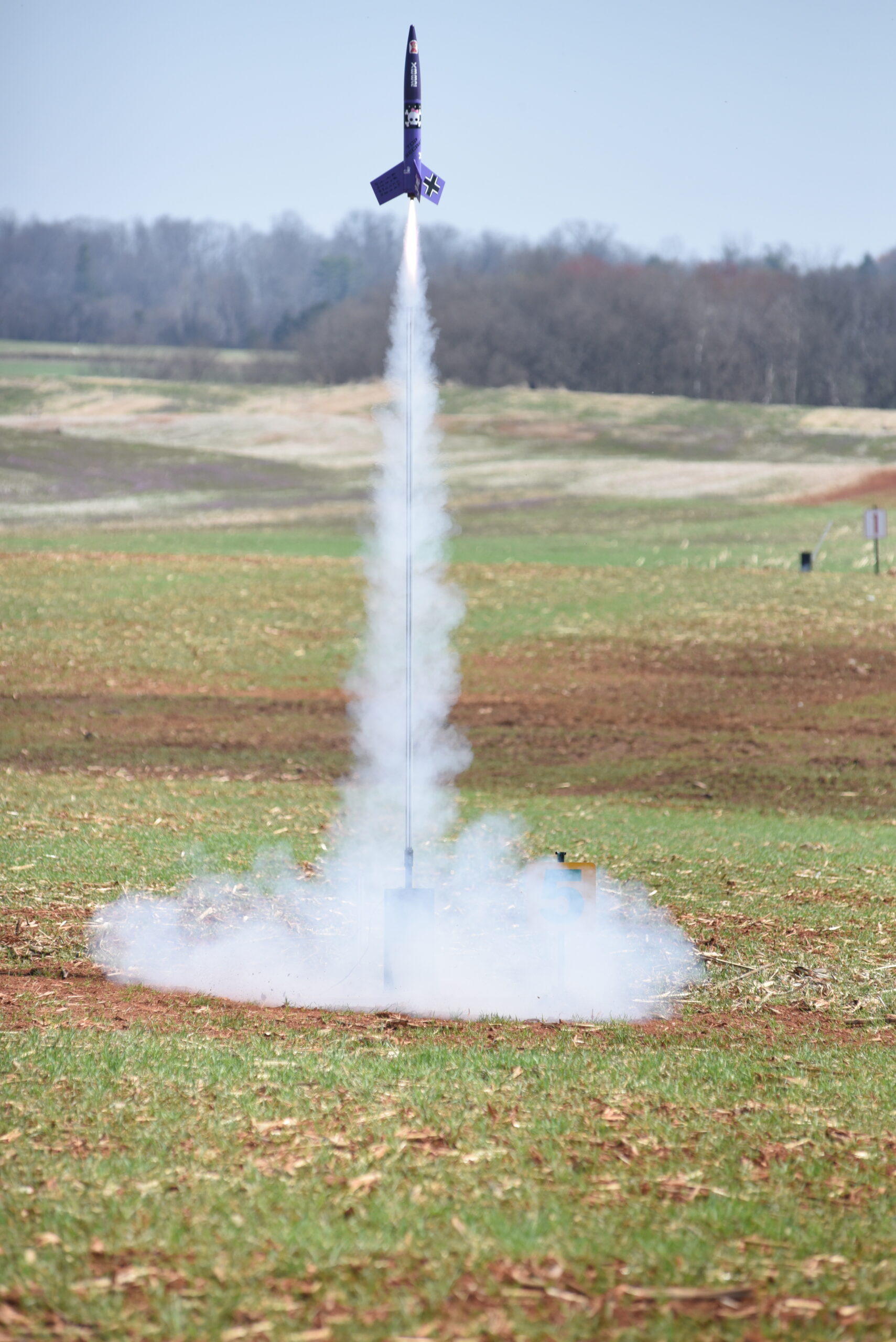 The DER Purple Max (Estes Pro Series II Kit) leaving the rail on an Aerotech G74 SuperWhite.